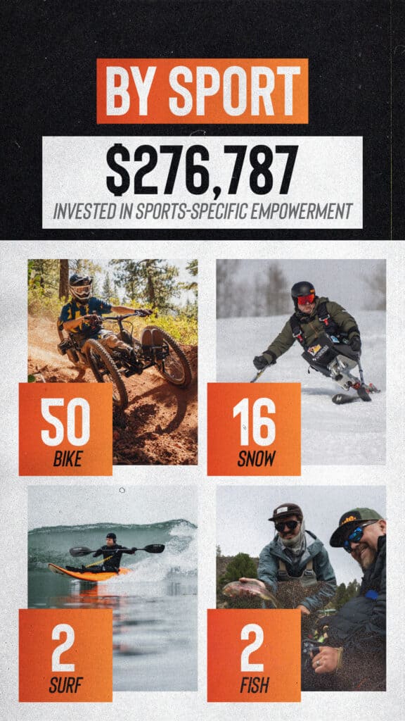 - Adaptive equipment remained the largest category, with 88 athletes receiving $325,437 to access tools such as adaptive mountain bikes, handcycles, wheelchairs, and ski equipment.