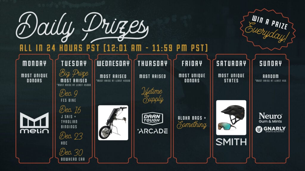 Awarded to the athlete who raises the highest total dollar amount during the specified 24-hour prize period (12:01 AM – 11:59 PM PST). Every donation counts toward the daily total.